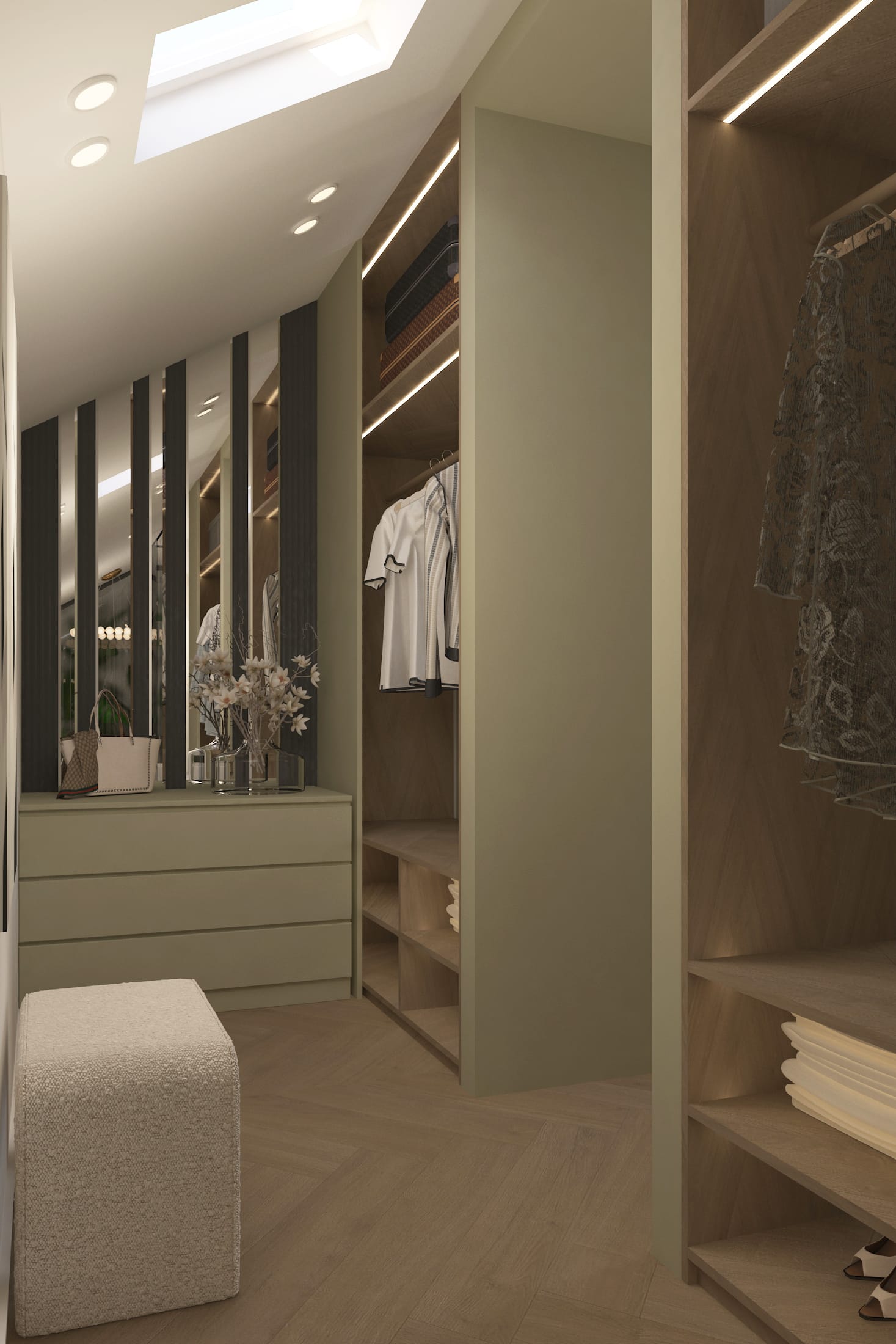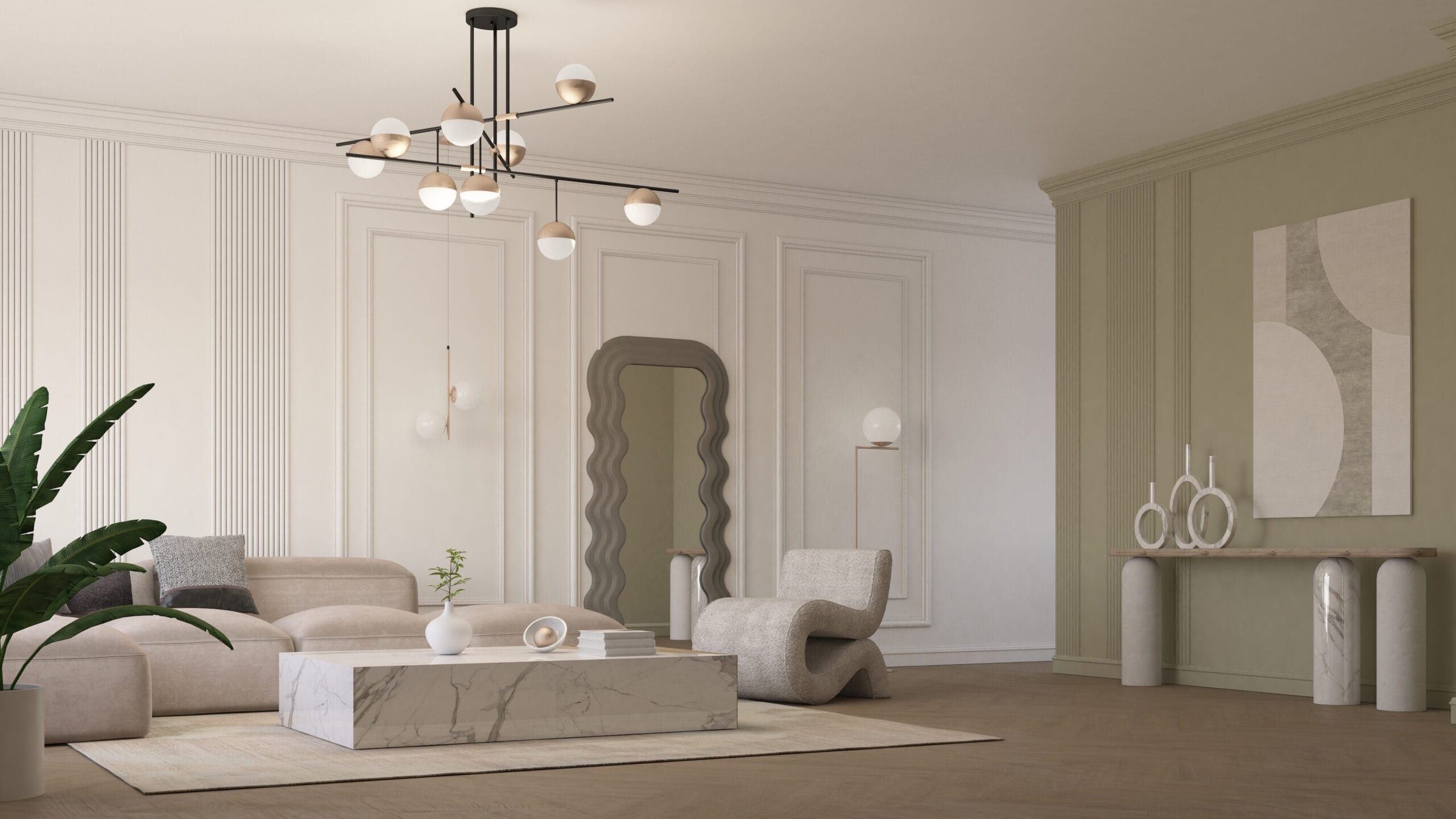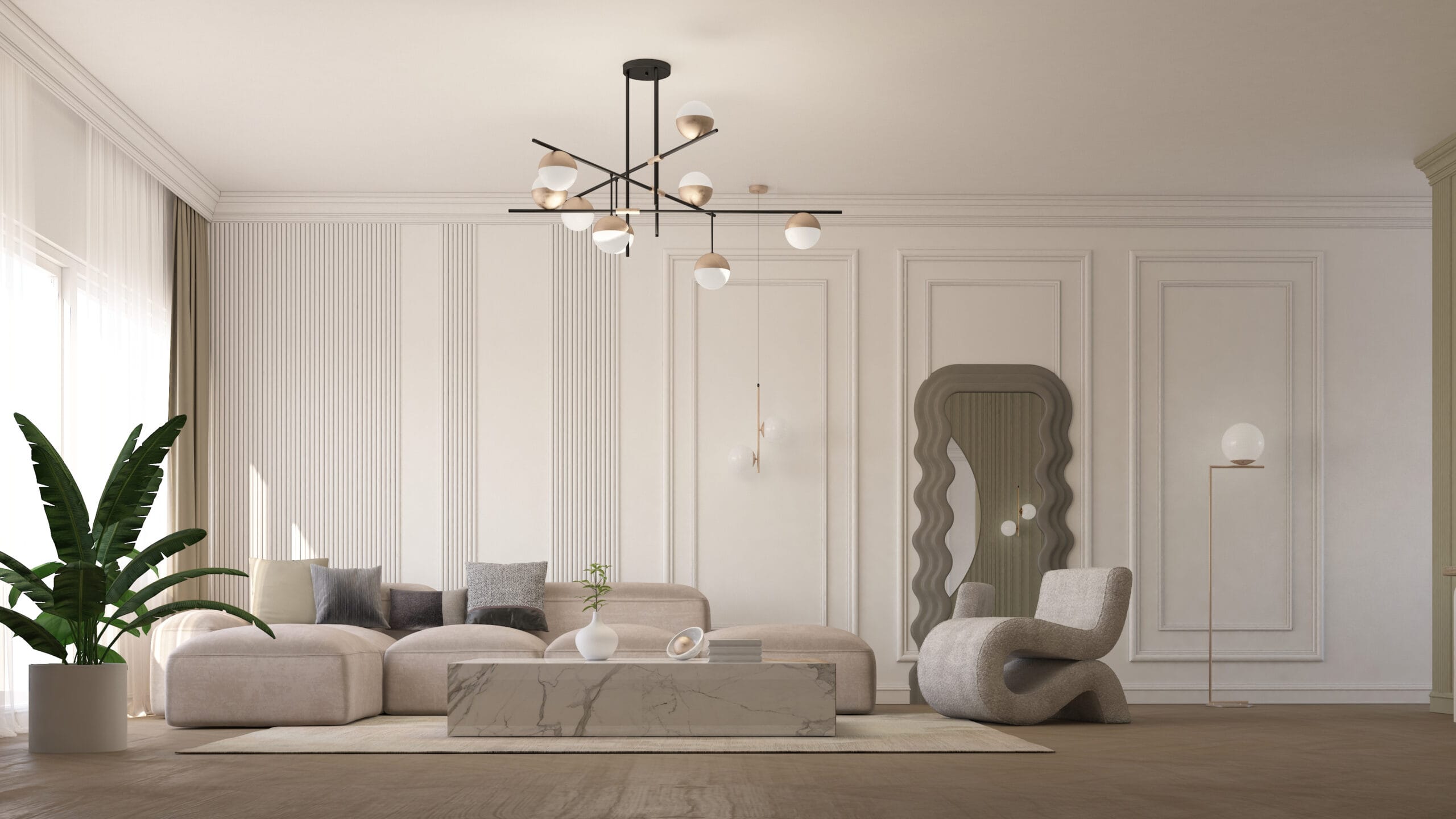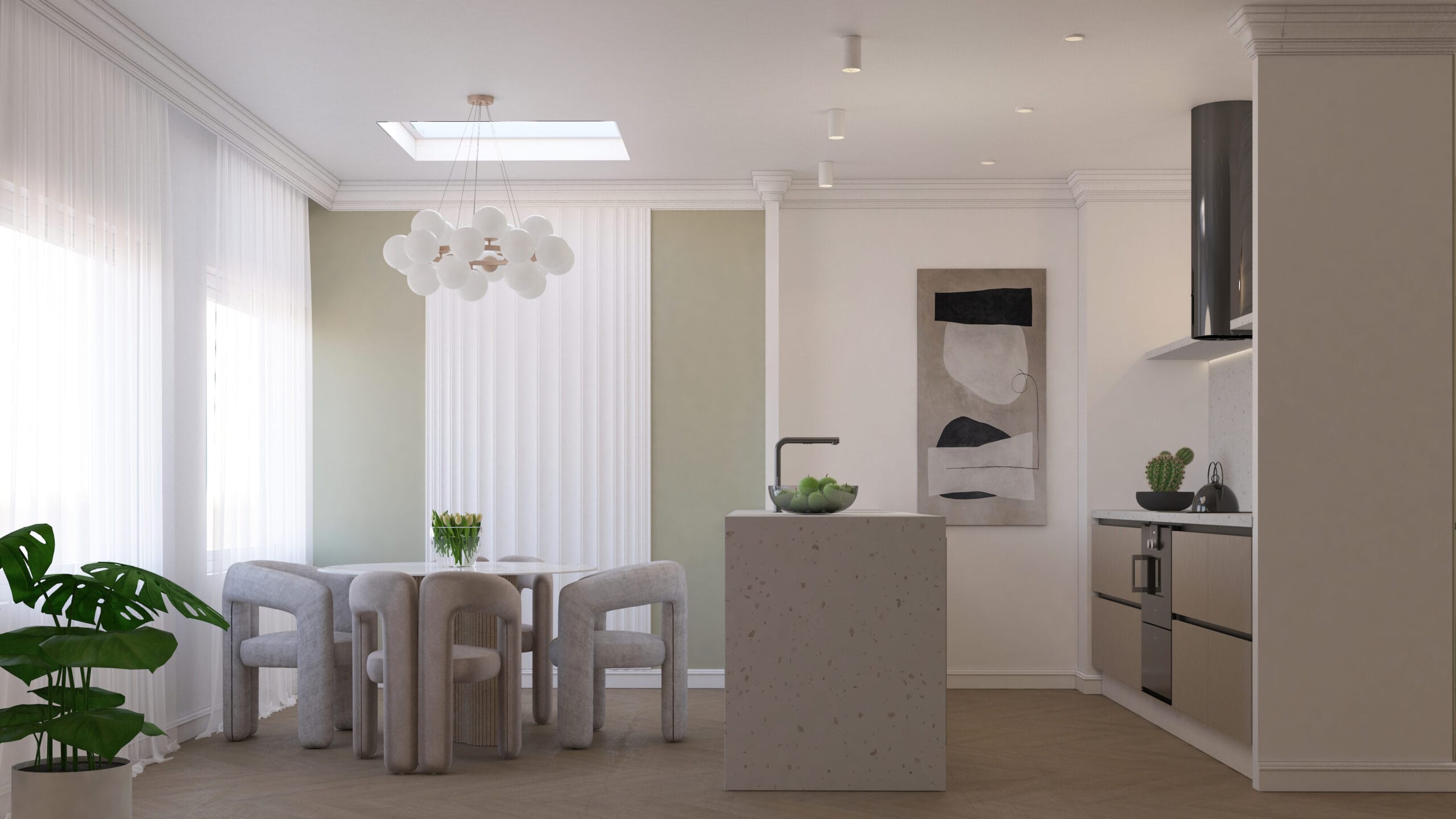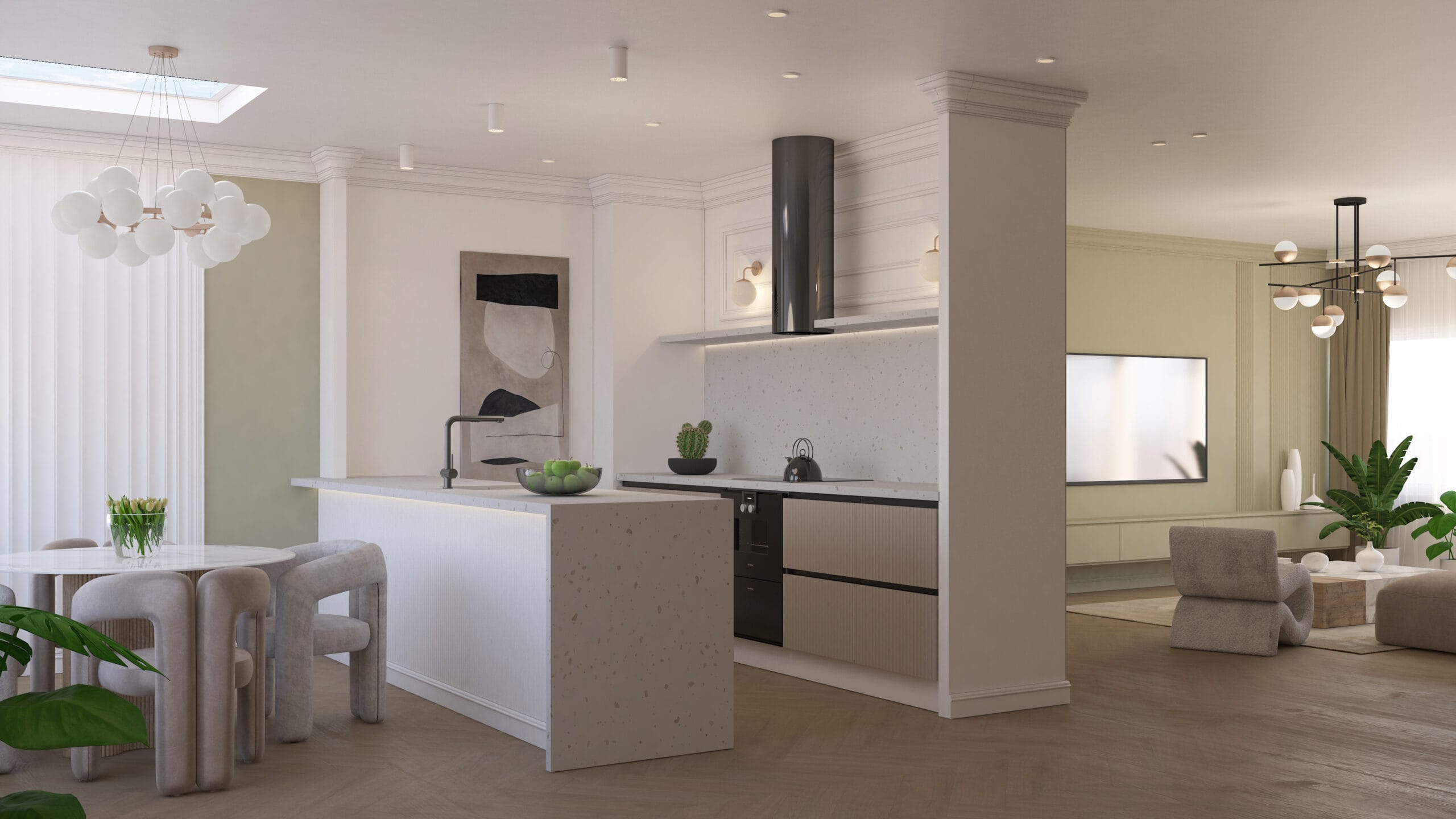 The open-plan living, kitchen, and dining area features soft neutral tones, sculptural furniture, and warm natural materials that enhance the apartment’s spacious feel. Custom details, clean lines, and subtle contrasts bring depth and sophistication, while large windows flood the interiors with daylight.
