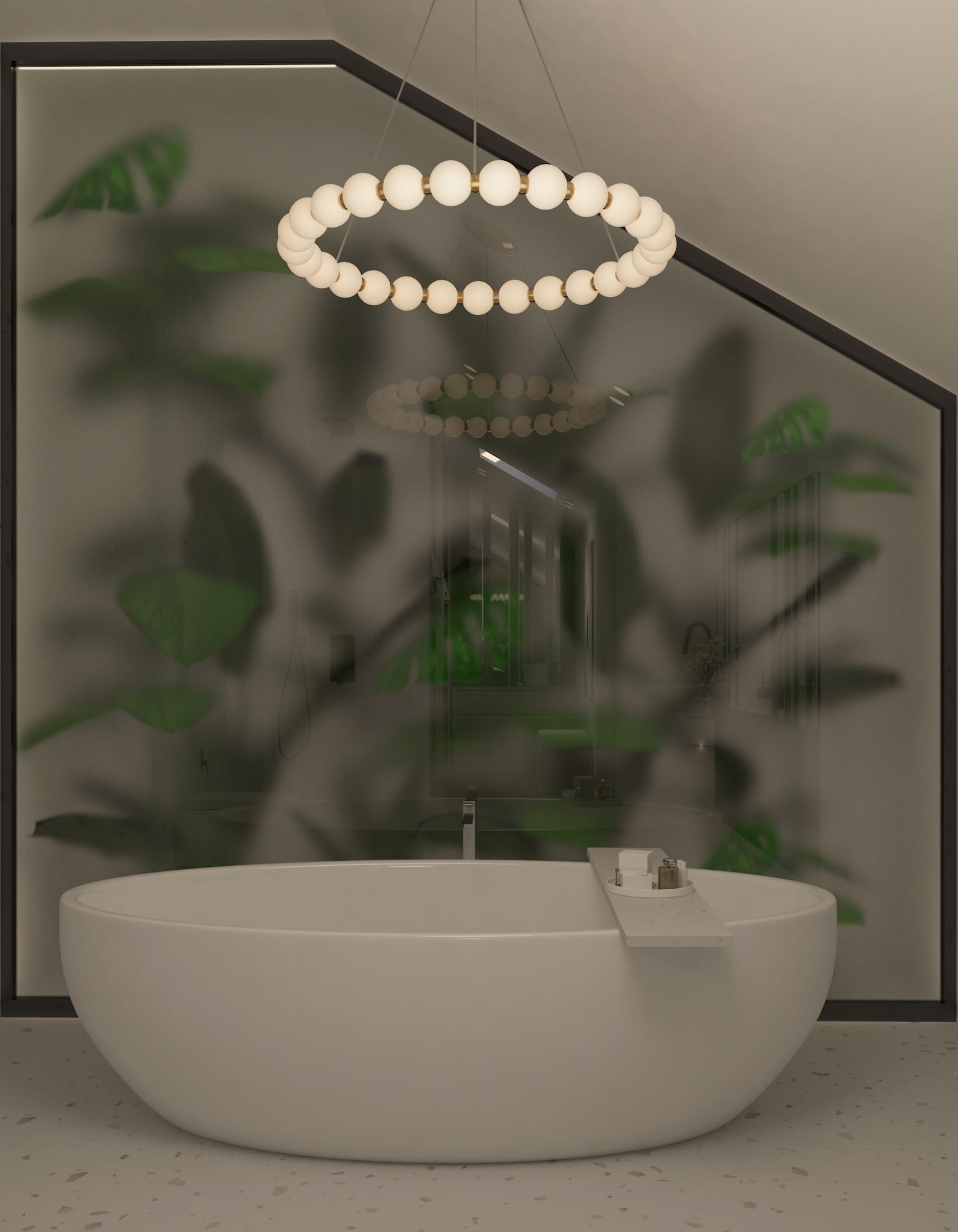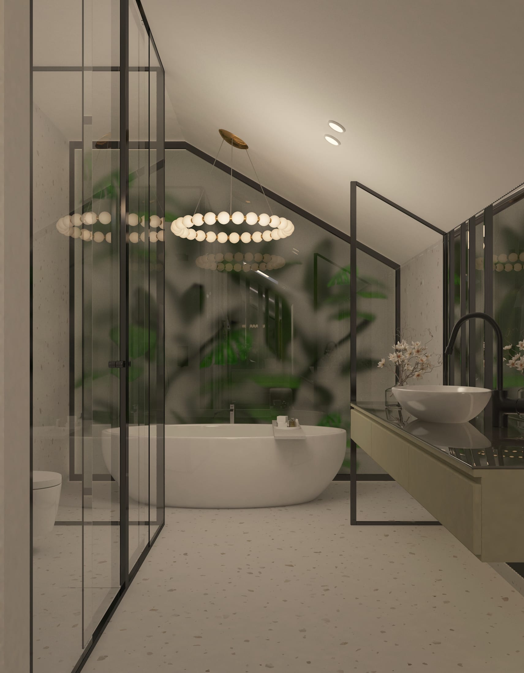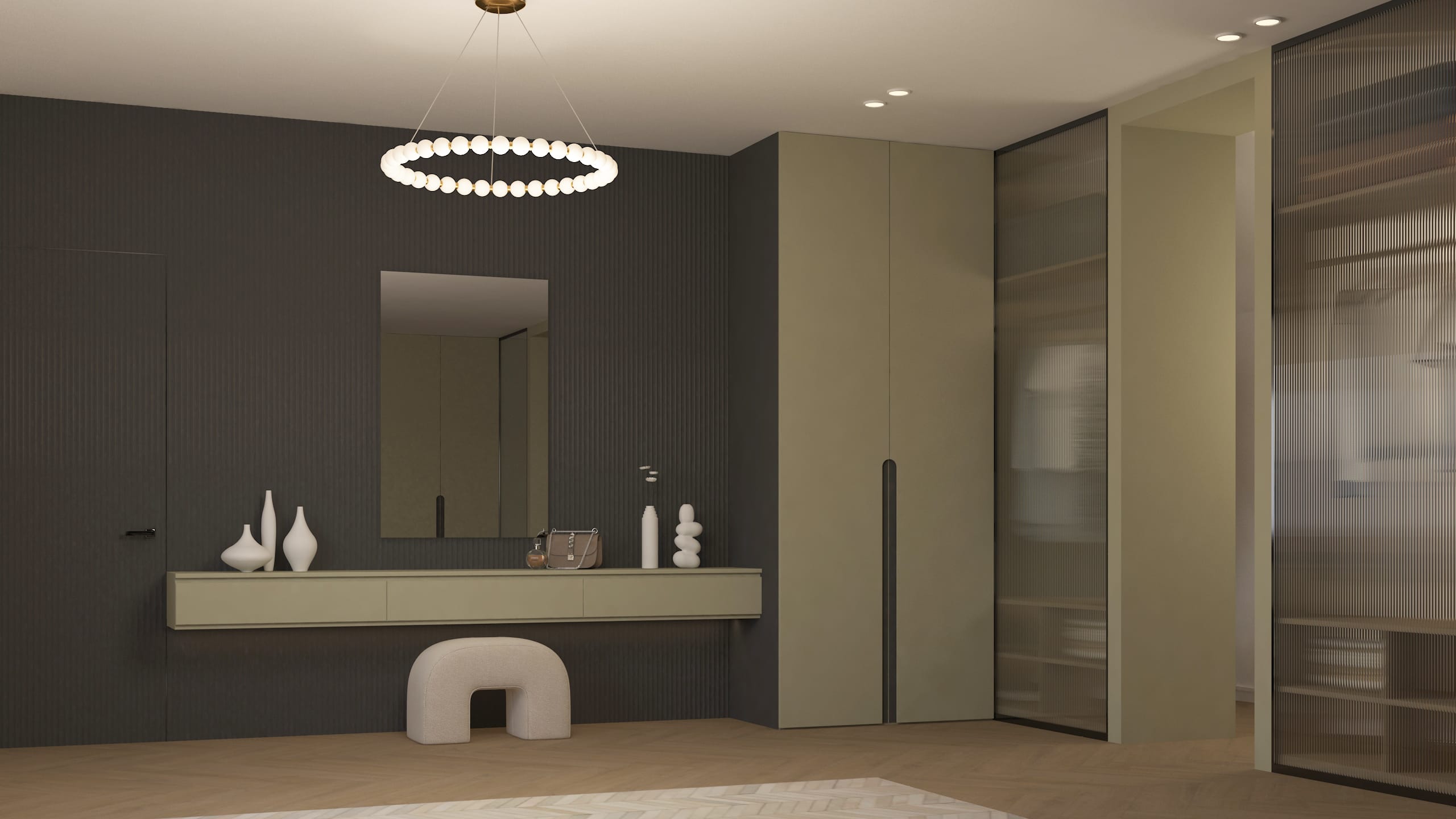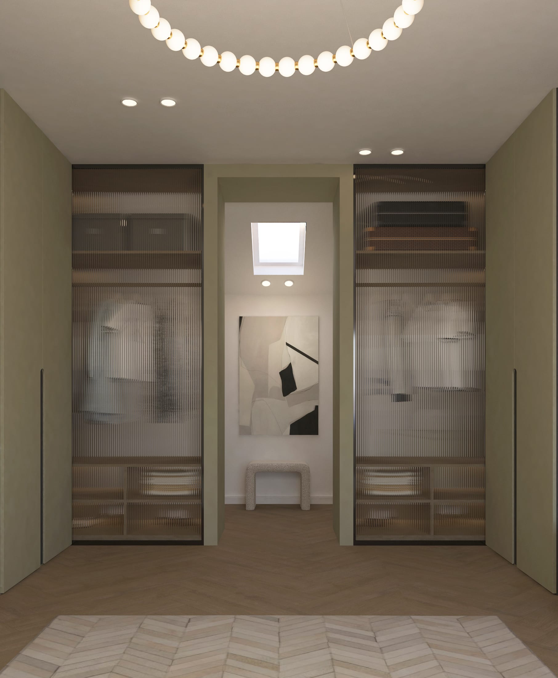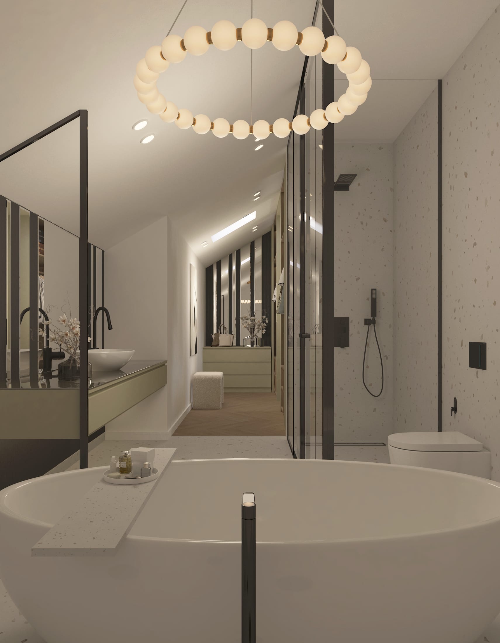 The entrance hallway introduces the serene mood of the apartment through muted colors and refined finishes. Moving through the space, the master bedroom exudes calm luxury with its warm tones, plush textiles, and an integrated walk-in closet that leads into a private ensuite bathroom. The bathroom is a true statement of modern elegance featuring a freestanding bathtub set beneath a sculptural chandelier, framed by a large window with greenery beyond, creating a tranquil, spa-like atmosphere.