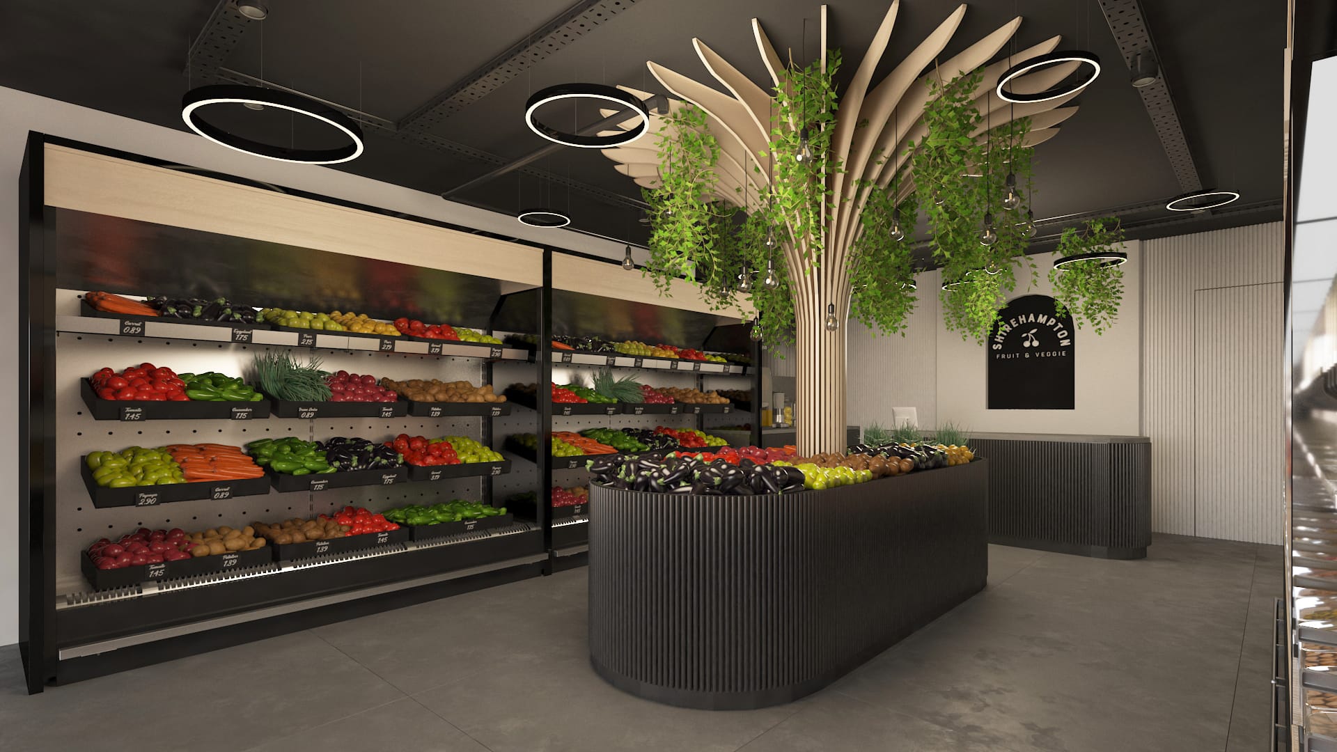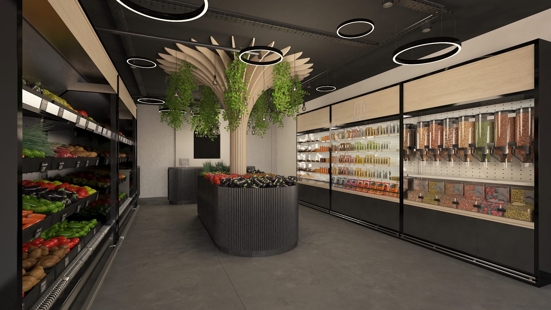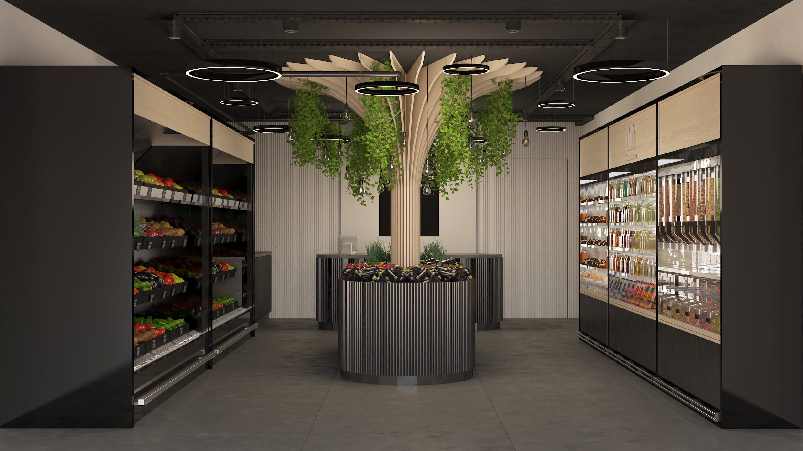 At the center of the market stands a parametric wooden tree, representing the “tree of life” and the source of fruit. This sculptural element combines organic form with precise craftsmanship, while integrated lighting and hanging plants enhance the connection between nature and design.
