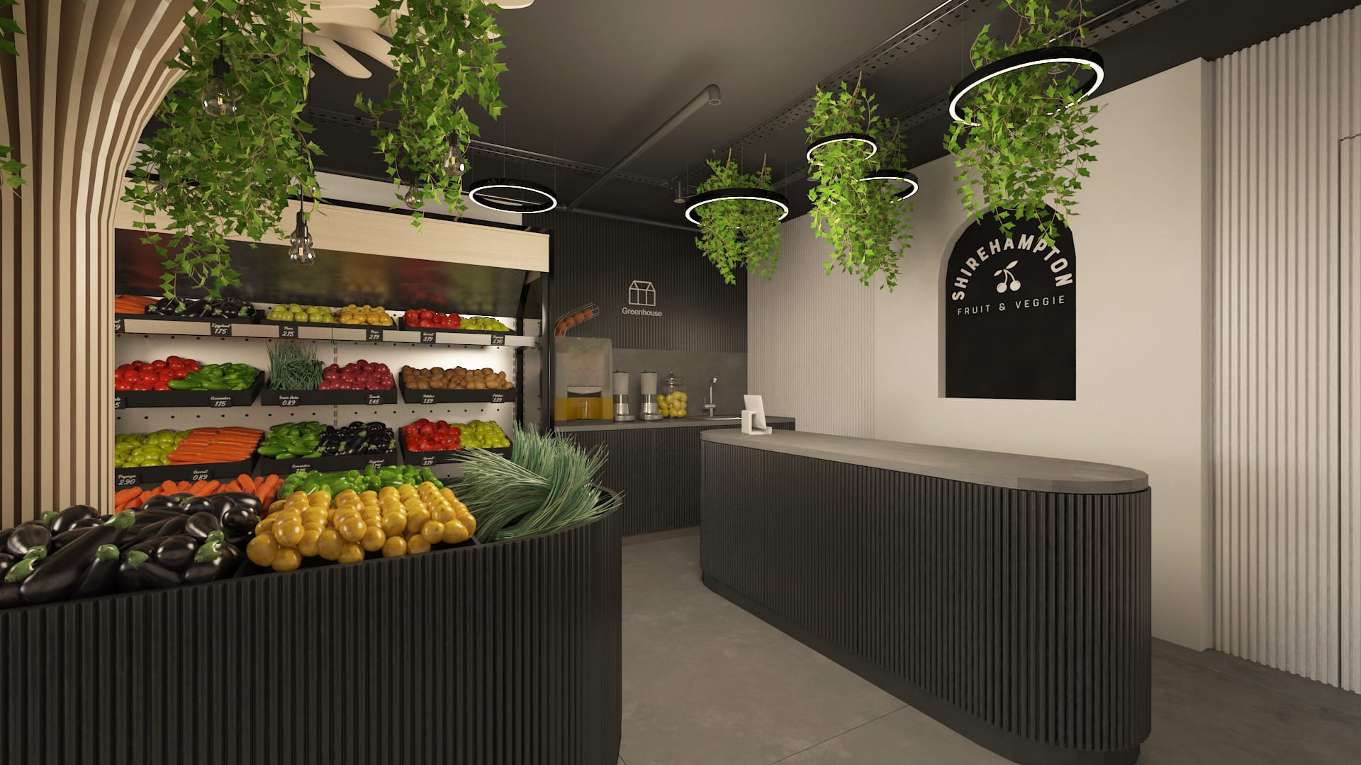 Shirehampton Fruit & Veggie is a contemporary fruit market designed to merge freshness, nature, and modern aesthetics. The interior features a refined black and white palette, accented with greenery and elegant chandeliers, creating a space that is both crisp and welcoming.